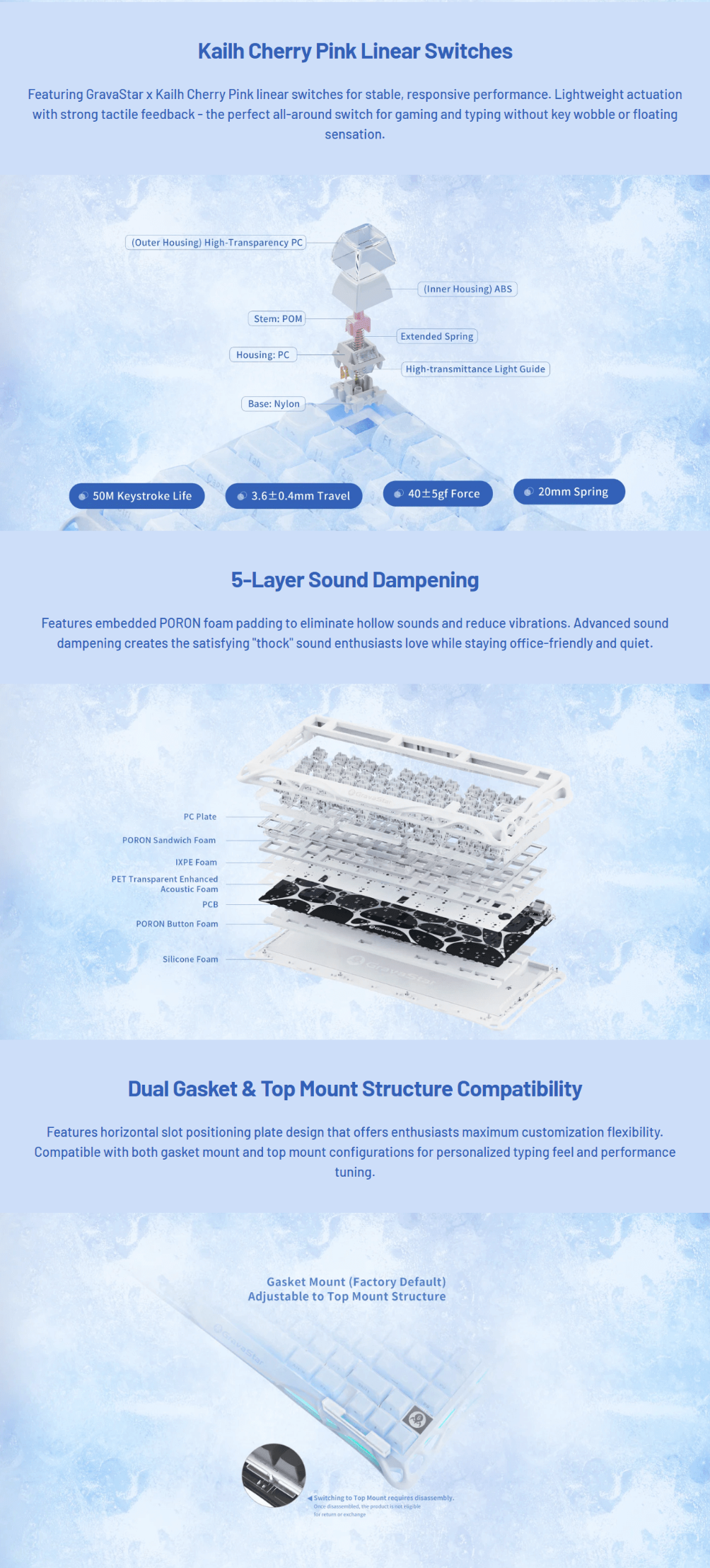 GravaStar x Kailh Cherry Pink linear key switches; 40gf actuation force, 1.5mm pre-travel, 3.5mm total travel