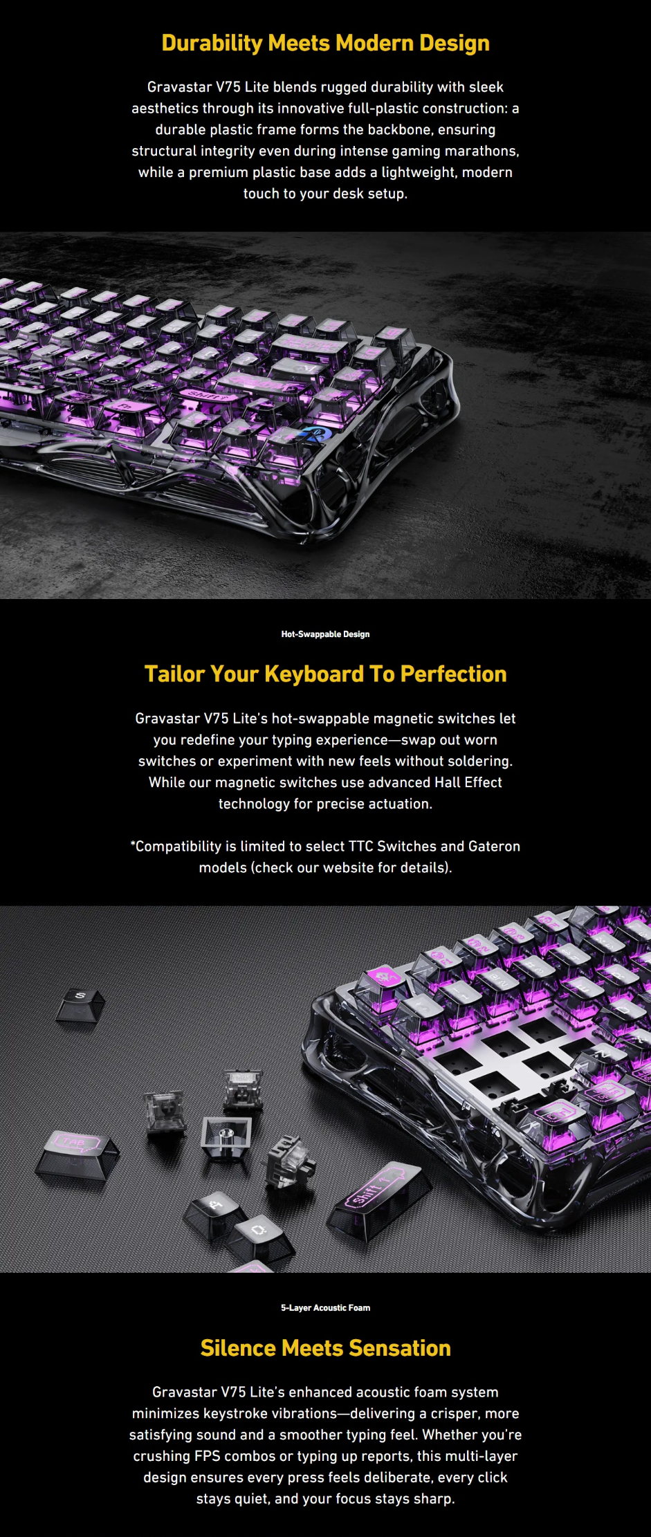 | Technical Specifications | Custom GravaStar Blackcore Switch: Engineered for 0.01mm precision with adjustable trigger depth (0.1mm–4.0mm) to eliminate lag and enhance control. |