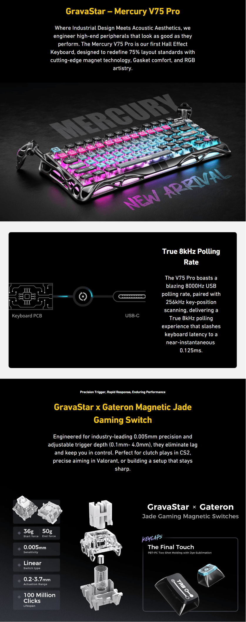 | GravaStar x Gateron Magnetic Jade Gaming Switch: | Engineered for 0.005mm precision with adjustable trigger depth (0.1mmโ4.0mm) to eliminate lag and enhance control. |