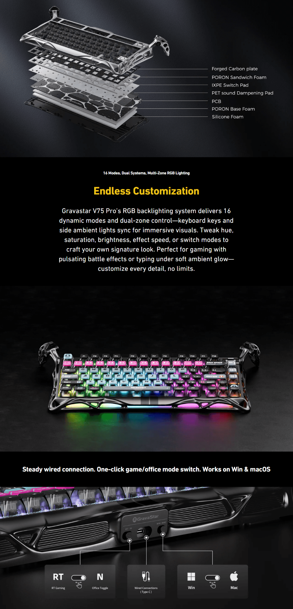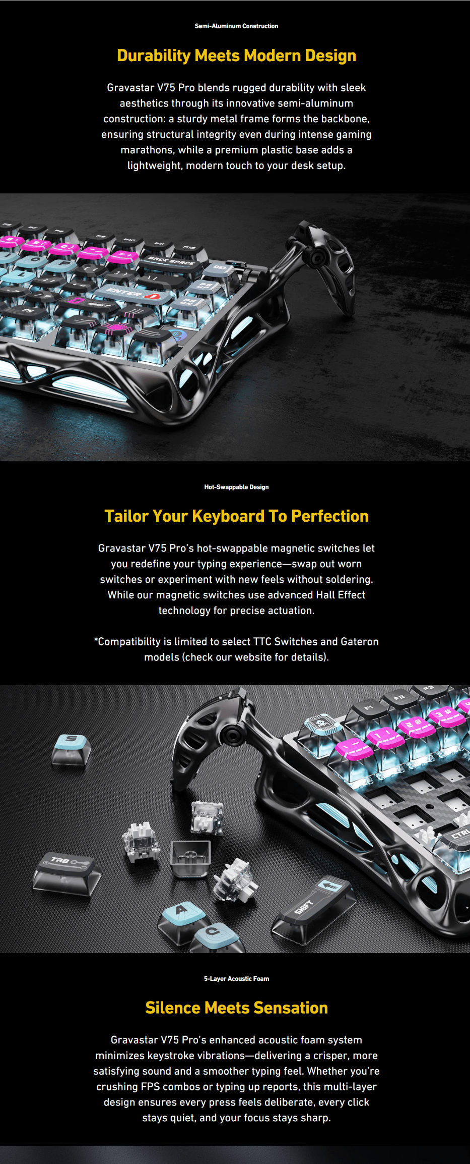| Hot-Swappable Design: | Allows switch swapping (no soldering) with magnetic Hall Effect switches; compatible with select TTC and Gateron models. |