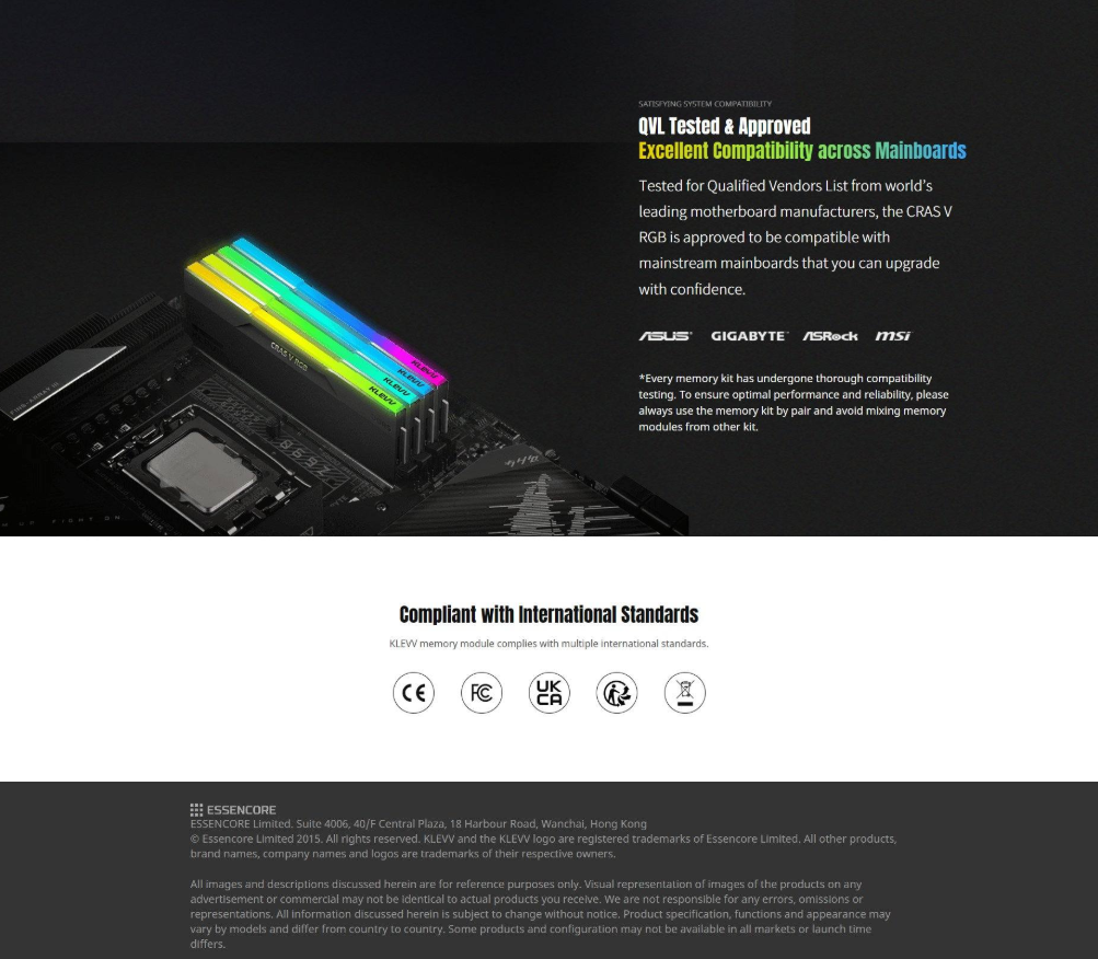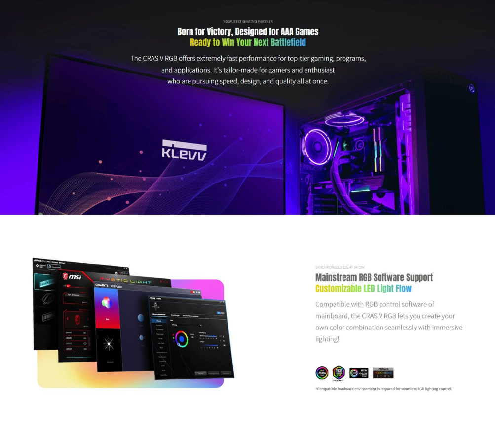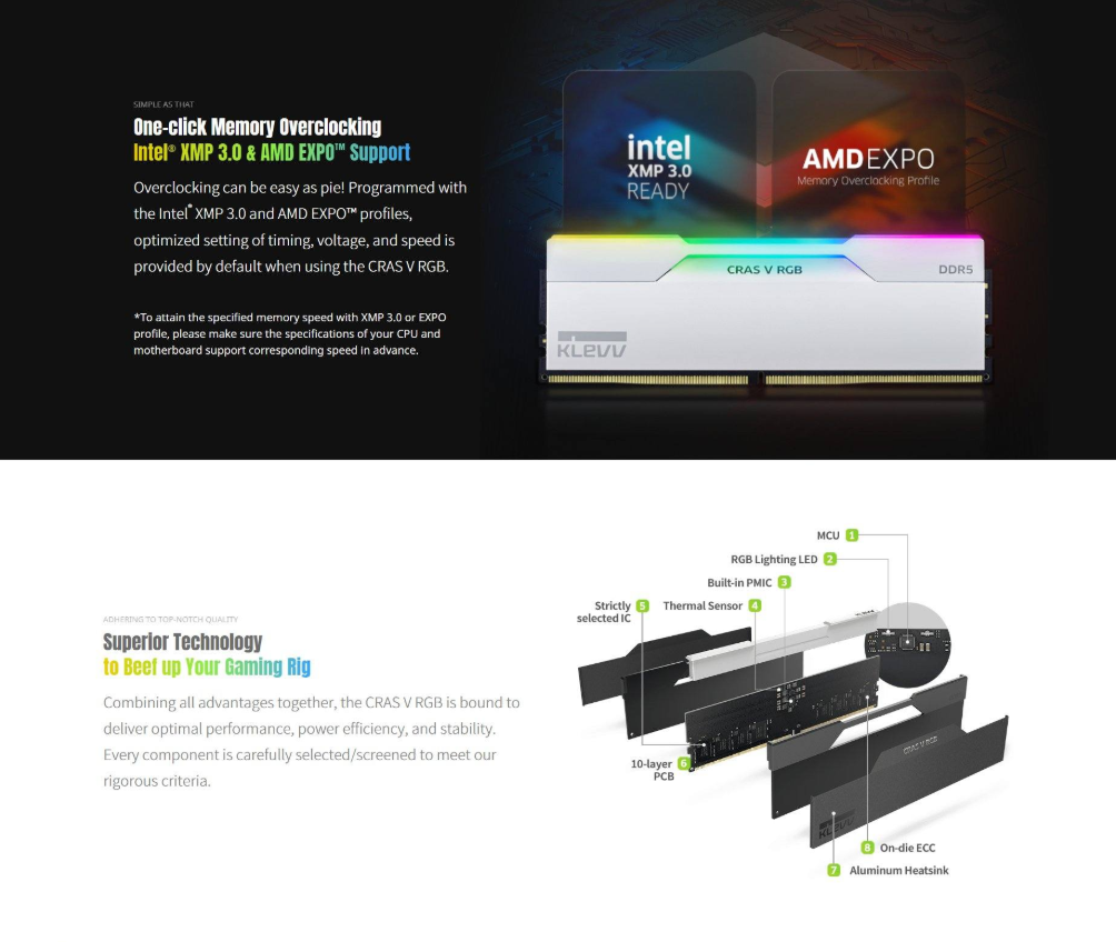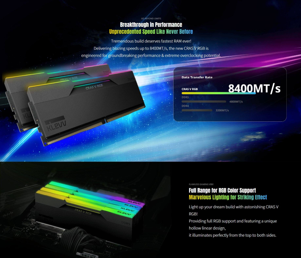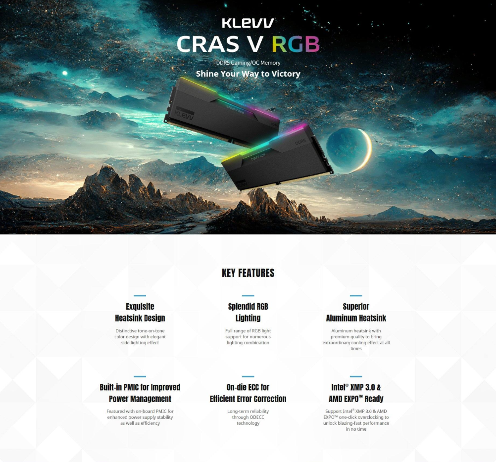 Upgrade your system with the Klevv CRAS V RGB 64GB (2 x 32GB) DDR5 Memory. Featuring a lightning-fast 6000MHz speed and CL30 latency, this memory is Intel® XMP 3.0 & AMD EXPO™ ready, ensuring optimal performance. Its exquisite black heatsink design and mesmerizing RGB lighting enhance your setup. With built-in PMIC for power management and on-die ECC for efficient error correction, experience superior reliability and efficiency. Fast dispatch and delivery available.