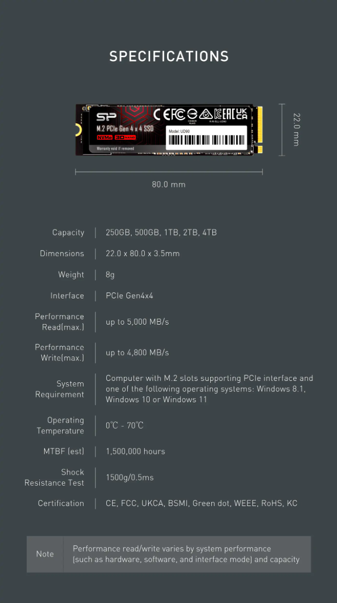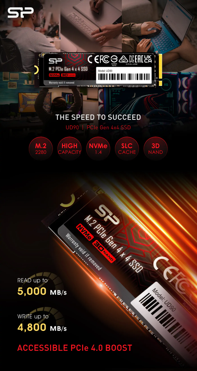 Silicon Power 1TB UD90 NVMe 4.0 Gen4 PCIe M.2 SSD R/W up to 5,000/4,800 MB/s